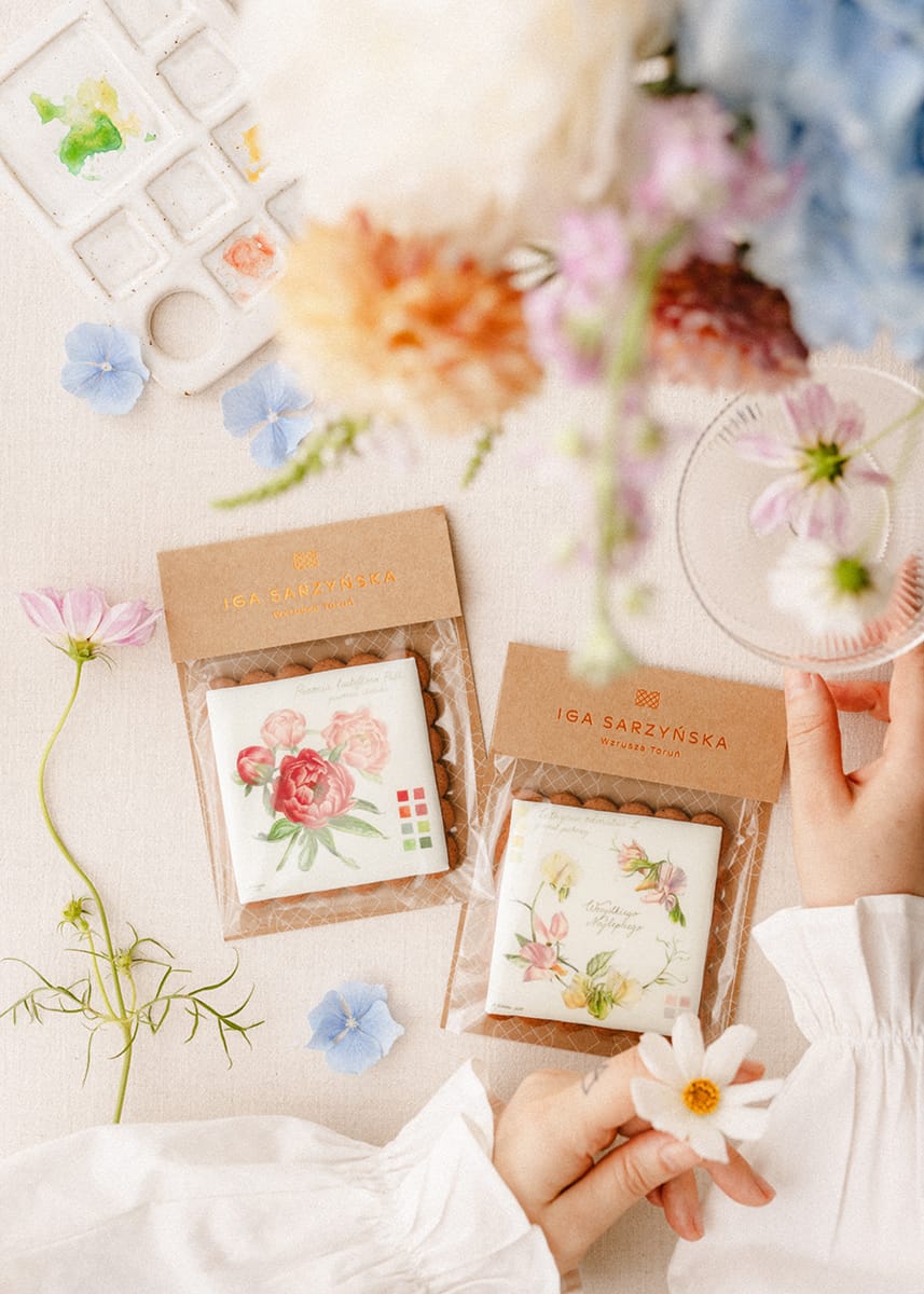 Pierniczki z kolekcji Kwiatowej zaprojektowała Magdalena Pilarska, artystka pochodząca z Torunia. Jest członkinią największego na świecie, prestiżowego brytyjskiego towarzystwa botanicznego – Society of Botanical Artists. Malarstwem botanicznym akwarelą zajmuje się od ponad czterech lat, a w swoich pracach umiejętnie łączy historię z pięknem natury. Inspiracje, które towarzyszą jej sztuce to kwiaty baroku, mowa kwiatów oraz archaiczne dzienniki botaniczne. W ubiegłym roku prace Magdaleny Pilarskiej wystawione zostały na Królewskiej Wystawie Róż - Royal Rose 2024 w Łazienkach Królewskich w Warszawie.