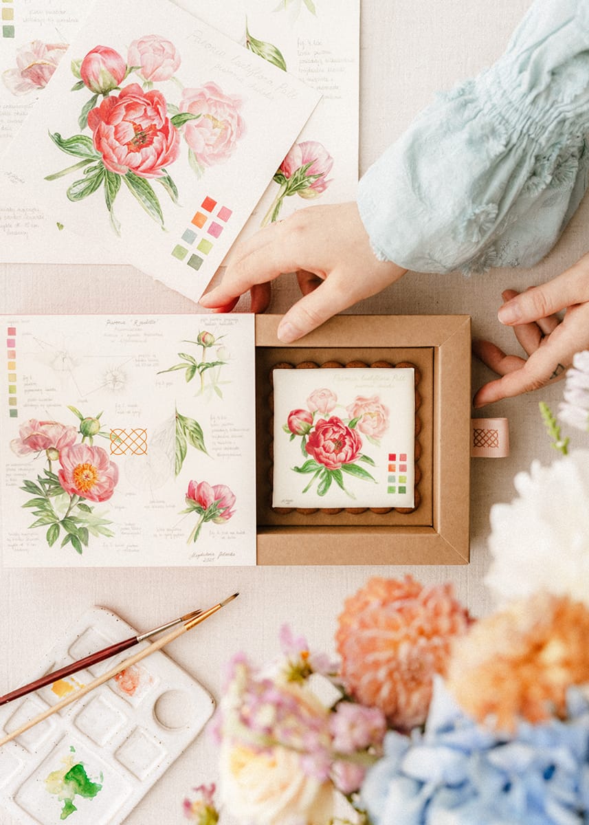 Każdy piernik w tej kolekcji to miniaturowe dzieło sztuki. Delikatne formy kwiatów na lukrze królewskim – ich przekroje, rozwijające się pąki, układ płatków i żyłkowanie liści wyglądają zjawiskowo. Inspiracją stały się tradycyjne tablice botaniczne, na których artyści przez wieki przedstawiali rośliny w sposób zarówno estetyczny, jak i naukowy – ukazując nie tylko ich piękno, ale też budowę.
