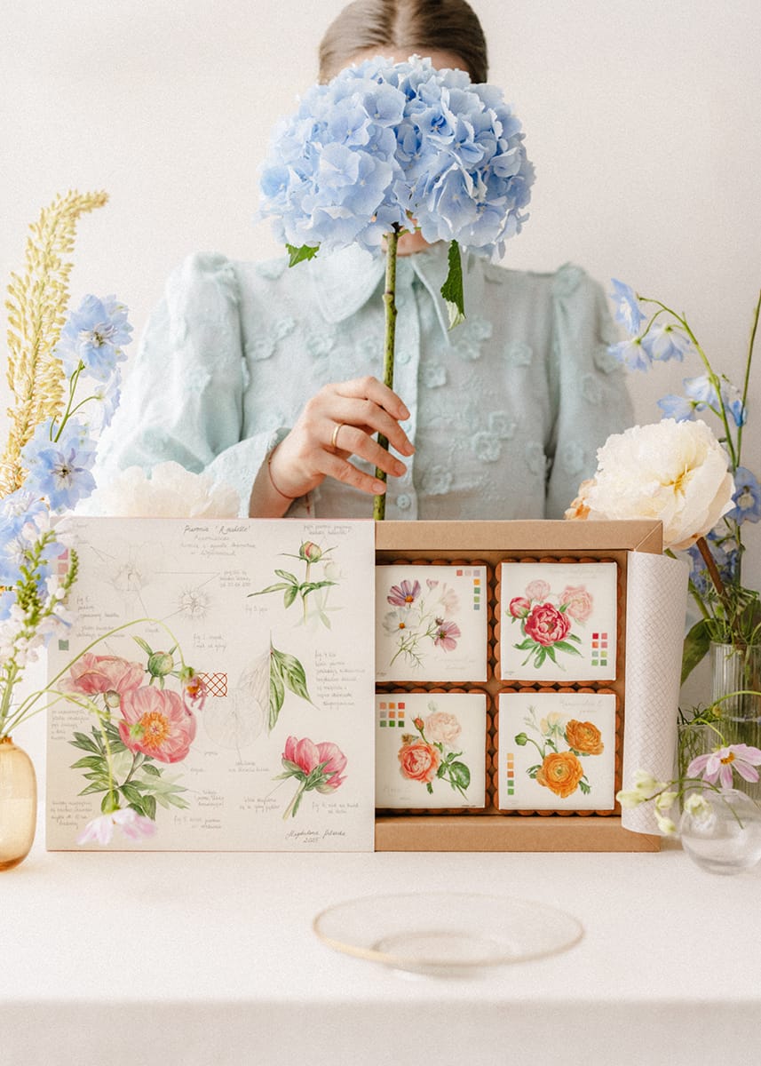 Wyjątkowym elementem kolekcji są także opakowania, ozdobione botanicznymi ilustracjami przedstawiającymi budowę kwiatu piwonii – z jego płatkami, pręcikami i zalążnią – ukazaną z naukową precyzją i artystyczną lekkością. To zapowiedź tego, co znajduje się w środku: harmonii smaku i formy, inspirowanej naturą.
