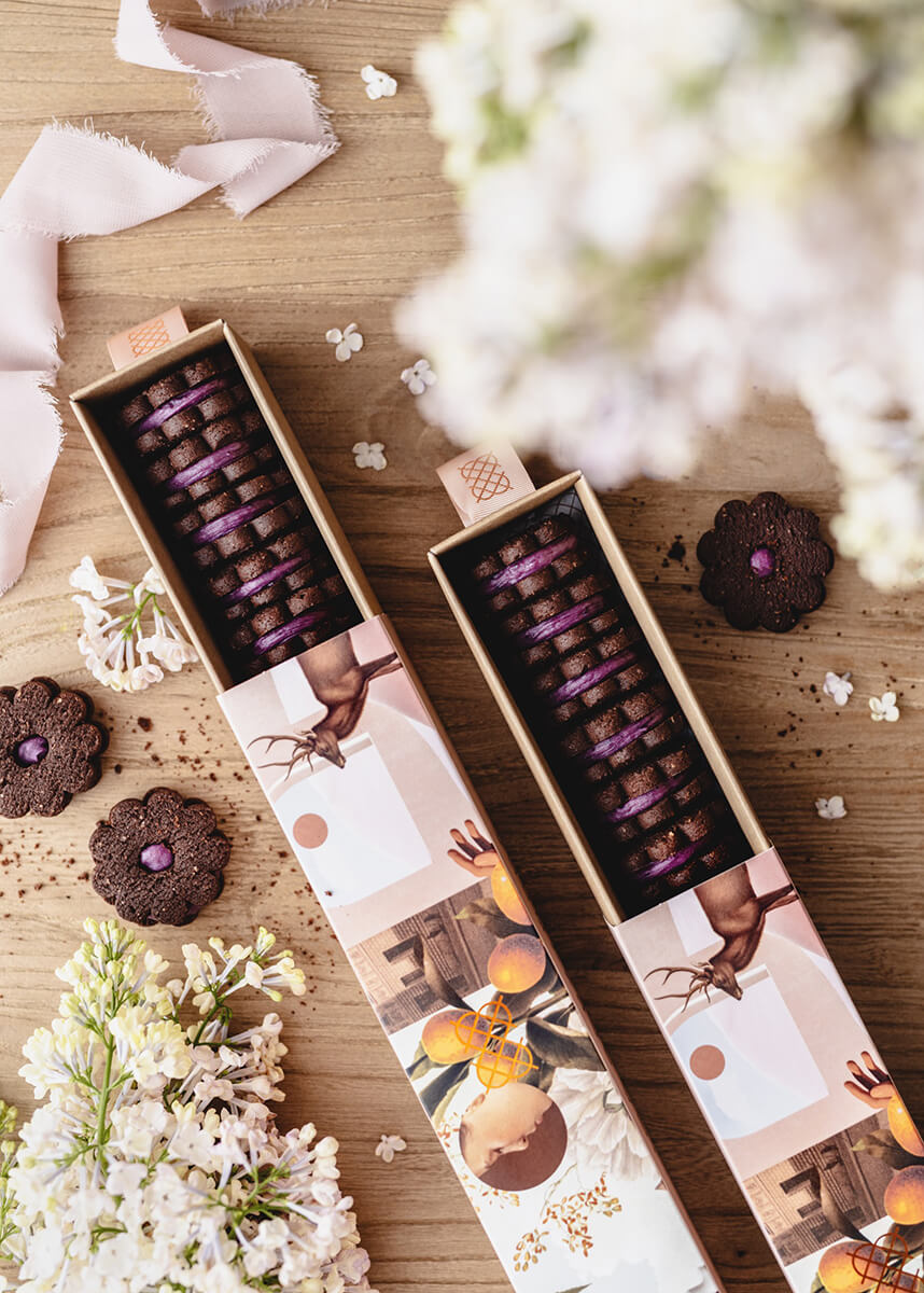 Połączenie orzeźwiającej czarnej porzeczki oraz słodkich kakaowych ciasteczek to idealny balans smaków! Markizy to ciasteczka typu shortbread przygotowane na bazie prawdziwego masła, mąki z migdałów, wyśmienitego kakao i mieszanki starannie wyselekcjonowanych korzennych przypraw. Dwa pyszne ciasteczka przełożyliśmy aksamitnym ganache na bazie naturalnego puree z czarnej porzeczki i białej, belgijskiej czekolady! Efekt końcowy zachwyca!