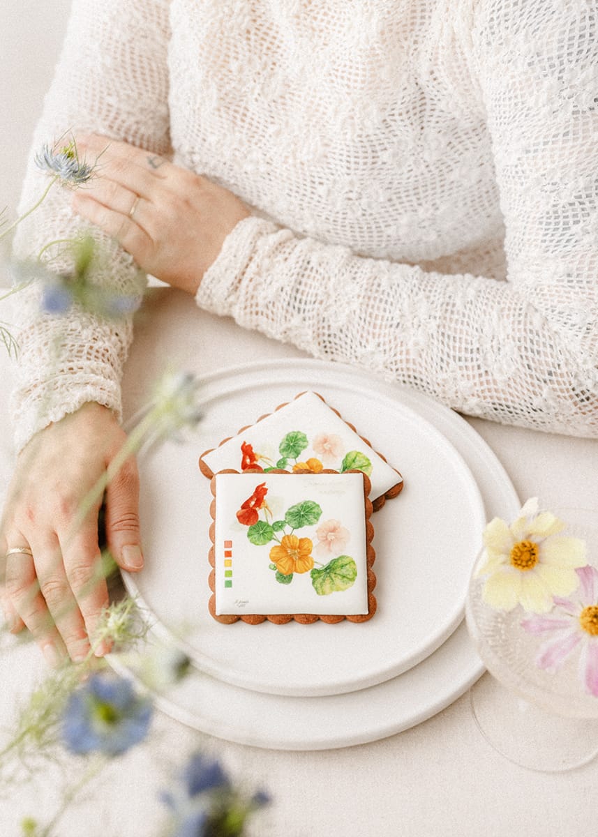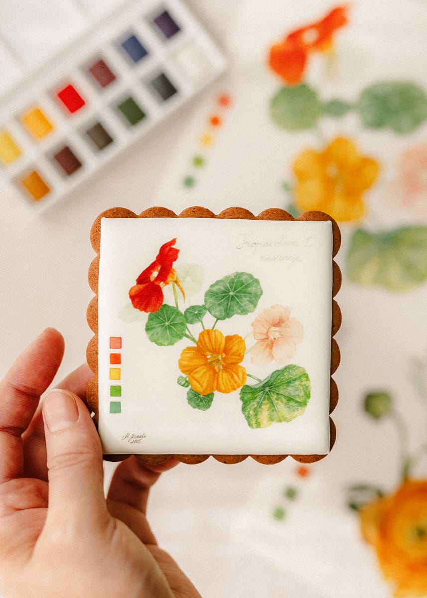 Pierniczek z botaniczną ryciną kwiatu nasturcji od Igi Sarzyńskiej to uroczy i wzruszający upominek.