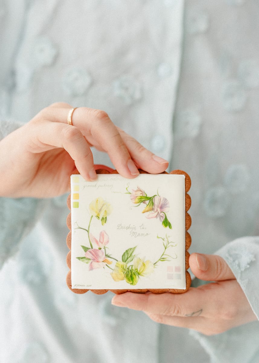 Pierniczek z botaniczną ilustracją pachnącego groszku i dedykacją to uroczy i wzruszający upominek dla Mamy!