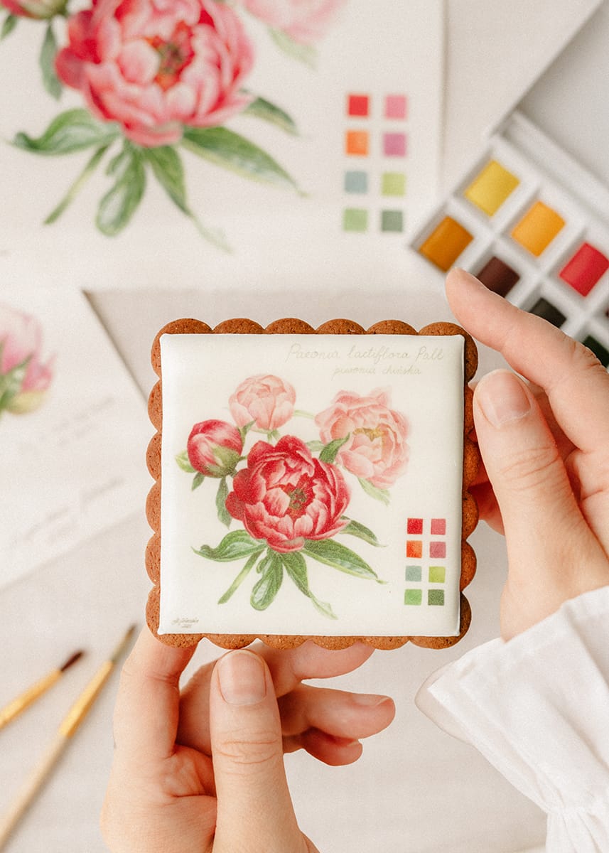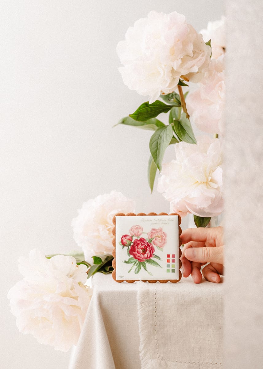 Pierniczek z botaniczną ryciną kwiatu piwonii od Igi Sarzyńskiej to uroczy i wzruszający upominek.
