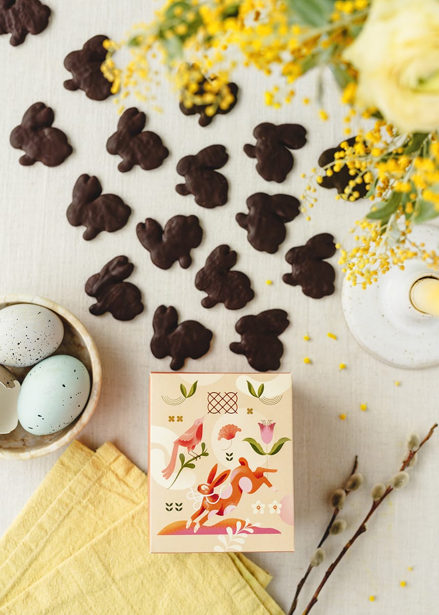 Poznajcie wyjątkowo urocze, delikatne wielkanocne pierniczki w kształcie zajączków oblanych wyśmienitą ciemną czekoladą. Doskonale dobrane przyprawy korzenne (w tym indyjski czarny pieprz), prawdziwe masło i aromatyczny miód sprawiają, że piernikowe zajączki smakują wyjątkowo.