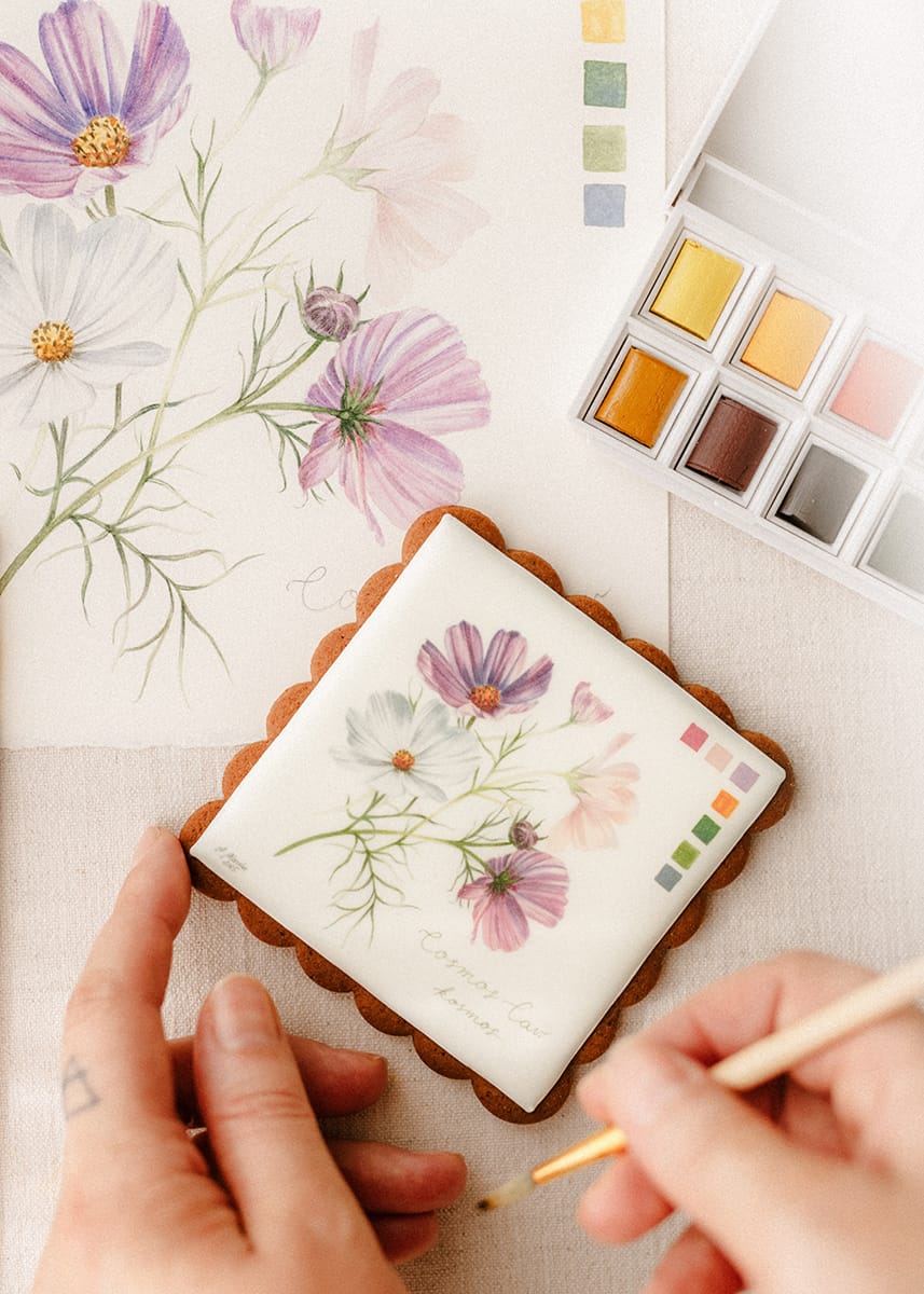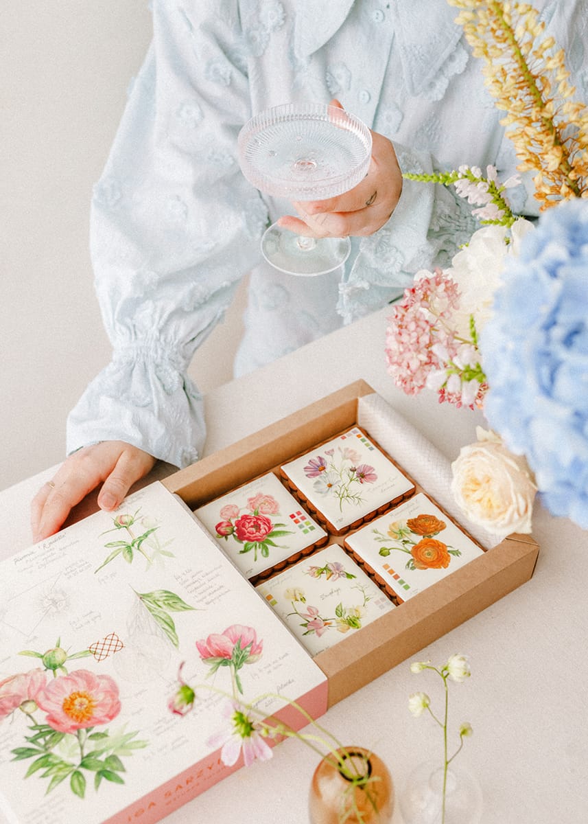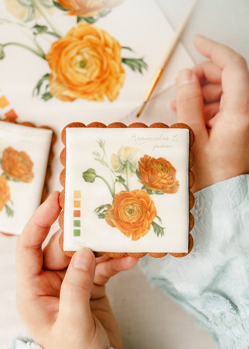 Pierniczki z kolekcji kwiatowej zaprojektowała Magdalena Pilarska, artystka pochodząca z Torunia. Jest członkinią największego na świecie, prestiżowego brytyjskiego towarzystwa botanicznego – Society of Botanical Artists. Malarstwem botanicznym akwarelą zajmuje się od ponad czterech lat, a w swoich pracach umiejętnie łączy historię z pięknem natury. Inspiracje, które towarzyszą jej sztuce to kwiaty baroku, mowa kwiatów oraz archaiczne dzienniki botaniczne. W ubiegłym roku prace Magdaleny Pilarskiej wystawione zostały na Królewskiej Wystawie Róż - Royal Rose 2024 w Łazienkach Królewskich w Warszawie.